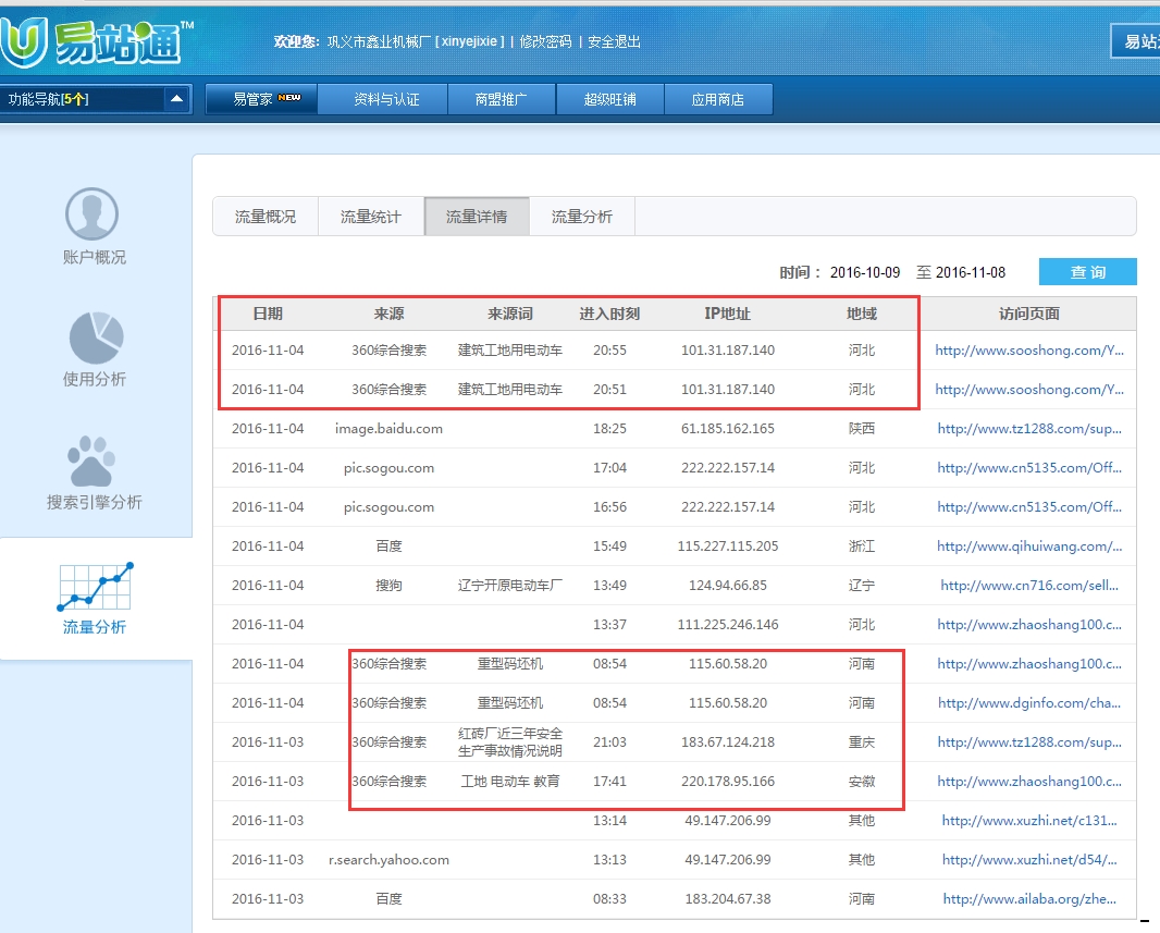鑫業(yè)機械關(guān)鍵詞與流量分析【通過分析我們可以方便的看到每天有沒有搜索您的關(guān)鍵詞】(如上圖)