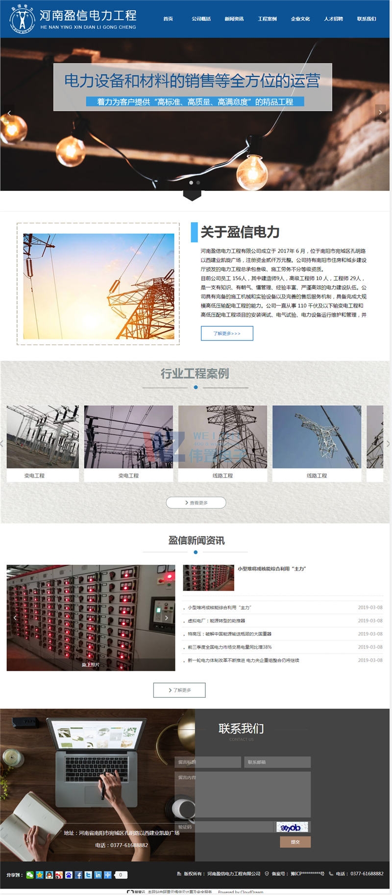 河南某信電力工程的新做的網(wǎng)站建設(shè)屬于展示型,網(wǎng)站上主要展示該企業(yè)的一些信息,比方:工程案例,企業(yè)文化等。網(wǎng)站選用藍(lán)色為導(dǎo)航欄目顏色,最主要一點是和該公司logo相匹配。域名選用了該企業(yè)的公司簡稱全拼英文,域名與網(wǎng)站名稱相對應(yīng)有助于百度收錄,也有助于客戶記住該企業(yè)。本網(wǎng)站為我公司與河南聯(lián)通合作的阿里云建站項目