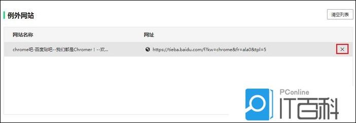 3、進入登錄管家設(shè)置頁面后,在頁面中找到“例外網(wǎng)站”這一欄,在其中找到永不保存的網(wǎng)頁,將鼠標(biāo)移動上去之后點擊其右側(cè)的按鈕將其刪除就可以了。